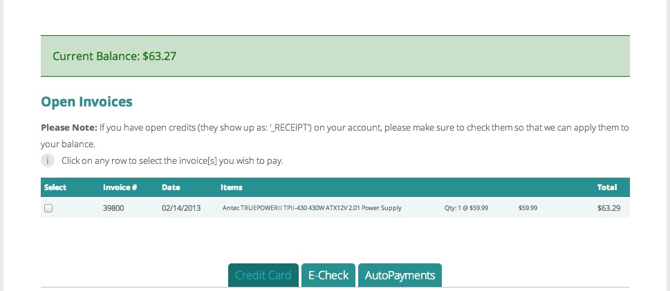 The payment page shows any current open invoices or credits that you have on your account. This page also shows to a grid of those items and allows you to open the payment history: